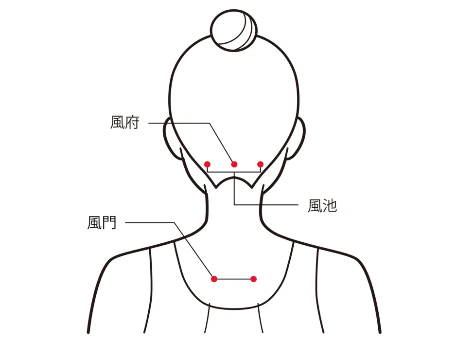 - 風池(ふうち)・・・首の後ろ、天柱の外側を生え際に沿って耳側へ少し移動した辺りのツボ。全身の色んな症状に効果的なツボ